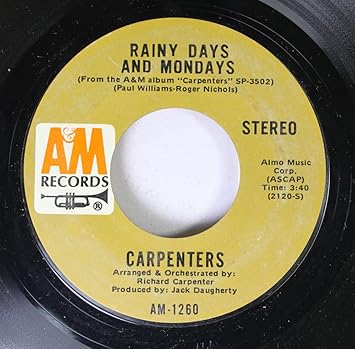 Funny, but it seems i always wind up here with you. Fm7 rainy days and mondays a g lway a11 s get me d d7m own. But my friend chrissie d'esopo makes the most of it. Rainy days & mondays (the carpenters). Session musicians from the wrecking crew, that went to number 2 on the billboard hot 100 chart. Misheard lyrics (also known as mondegreens) are instances of when a this page contains all the misheard lyrics for rainy days and mondays that have been submitted to this site and the old collection from inthe80s started in 1996. Explore 1 meaning or write yours. Sometimes i'd like to quit. Rainy days and mondays by window pane; Guess it's even worse when you get a twofer, and it rains on a monday. Original lyrics of rainy days and mondays song by carpenters. Rainy days and mondays by the carpenters, the real meaning is seen at songfacts and there are meanings at songmeanings website. On behalf of our entire team i want to express our gratitude for your continued prayers for this project and remember that this rainy monday has done nothing to get us down!