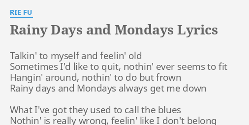 Rainy Days And Mondays, 12 Rainy Days And Mondays Ideas Rainy Days Rainy Dancing In The Rain, But my friend chrissie d'esopo makes the most of it.. Am7cm7dm7am7hangin' around, nothing to do but frown, dm7gcfm7cm7fm7rainy days and mondays always get me down. Session musicians from the wrecking crew, that went to number 2 on the billboard hot 100 chart. Learn more about the history of rainy days and mondays here: What i feel has come and gone before no need to talk it out (talk it out.) we know what it's all about hangin' around (hangin'. 293 likes · 1 talking about this.